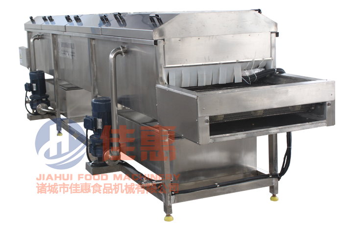 1、設(shè)備采用優(yōu)質(zhì)SUS304不銹鋼制作,符合國家食品出口標準。采用高壓噴淋清洗,清洗能力大、洗凈率高且不損傷物料,特別適合嬌嫩蔬果、雜質(zhì)多、難去除的食品清洗,可與篩板、網(wǎng)帶式氣泡清洗機組合使用。 2、隧道式高壓噴淋清洗機特別適合于大姜的清洗,在大姜清洗流水線中是不可缺少的一部分。大姜清洗流水線主要是由氣泡清洗段、高壓噴淋清洗段、成品挑選去雜段等組成,廣泛適用于國內(nèi)各生姜出口廠家。物科通過氣泡清洗段,刷洗生姜表面的大部分泥沙,自動提升到高壓清洗環(huán)節(jié),進行生姜的徹底清洗,噴淋段采取可調(diào)節(jié)噴頭,控制噴頭出水量,更好的保護生姜表皮,達到產(chǎn)品出口要求。 設(shè)備示意圖: